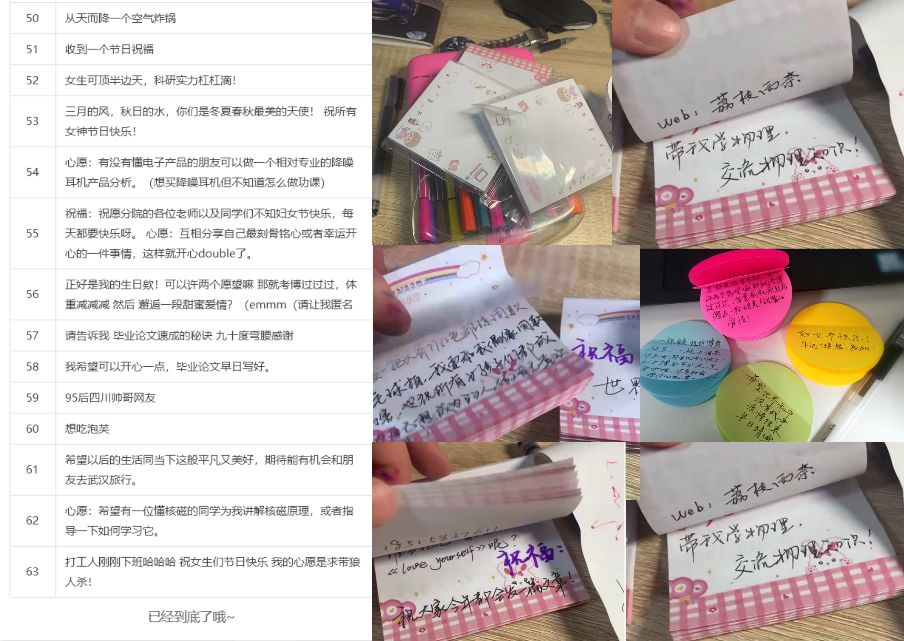 节日前夕,evo真人视讯研究生顺利获得线上方式写下了心愿和节日祝福,研究生会的同学们将它们一份份手抄下来,并在3月8日当天,贴在小洪山和东湖两个园区的“心愿树”上(线上征集的心愿与祝福详见文末)。