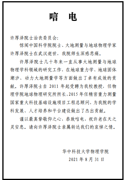 当前位置:evo真人视讯 > 专题 > 深切缅怀许厚泽院士 > 各界唁电